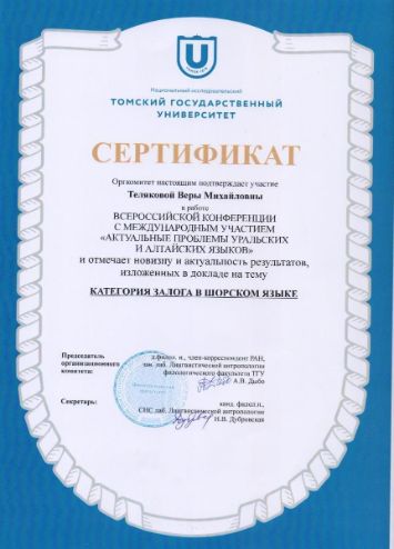 26. В.М. Телякова приняла участие во Всероссийской научно-практической конференции с международным участием «Алтайское языкознание: проблемы и исследования», посвящённой 150-летию первой «Грамматики алтайского языка». (Горно-Алтайск, Горно-Алтайский государственный университет, 18-22 июня): представила доклад и сдала в печать статью, которая опубликована: Телякова В.М. Актантная система простых пассивных предложений шорского языка // Алтайское языкознание: проблемы и исследования. Материалы Всероссийской научно-практической конференции с международным участием «Алтайское языкознание: проблемы и исследования», посвящённой 150-летию первой «Грамматики алтайского языка» (Горно-Алтайск, Научно-исследовательский институт алтаистики им. С. С. Суразакова, 18-22 июня 2019 г.). - Горно-Алтайск: НИИ алтаистики им. С. С. Суразакова, 2019. - С. 103-110.