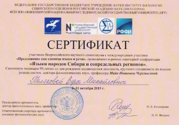 30. В.М. Телякова приняла участие во Всероссийском научном симпозиуме с международным участием «Предложение как единица языка и речи», проводимом в рамках ежегодной конференции «Языки народов Сибири и сопредельных регионов» и посвящённом 95-летию со дня рождения проф. М.И. Черемисиной (Новосибирск, Институт филологии СО РАН, 8-11 октября): представила доклад и сдала в печать статью, которая опубликована: Телякова В.М. Грамматические особенности пассивных конструкций в шорском языке // Предложение как единица языка и речи. Материалы Всероссийского научного симпозиума с международным участием «Предложение как единица языка и речи», посвящённого 95-летию со дня рождения проф. М.И. Черемисиной (Новосибирск, Институт филологии СО РАН, 8-11 октября 2019 г.). - Новосибирск: ИФЛ СО РАН, 2019. - С. 70-72.